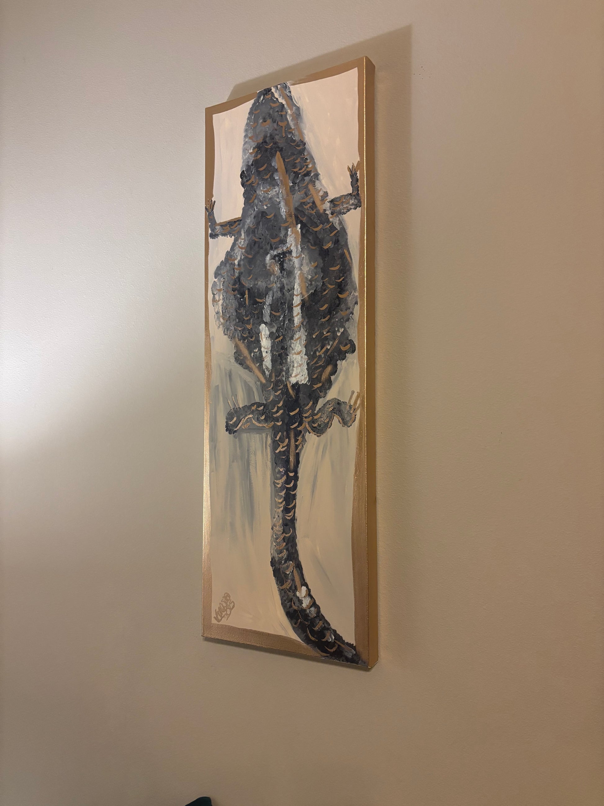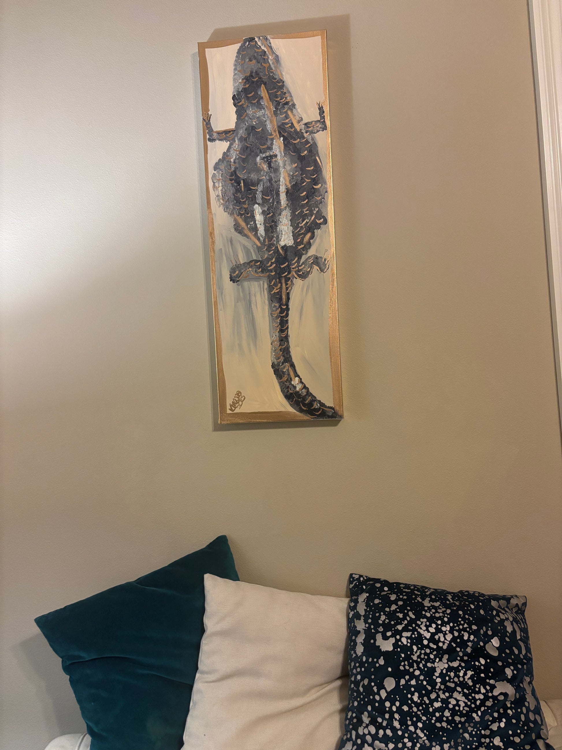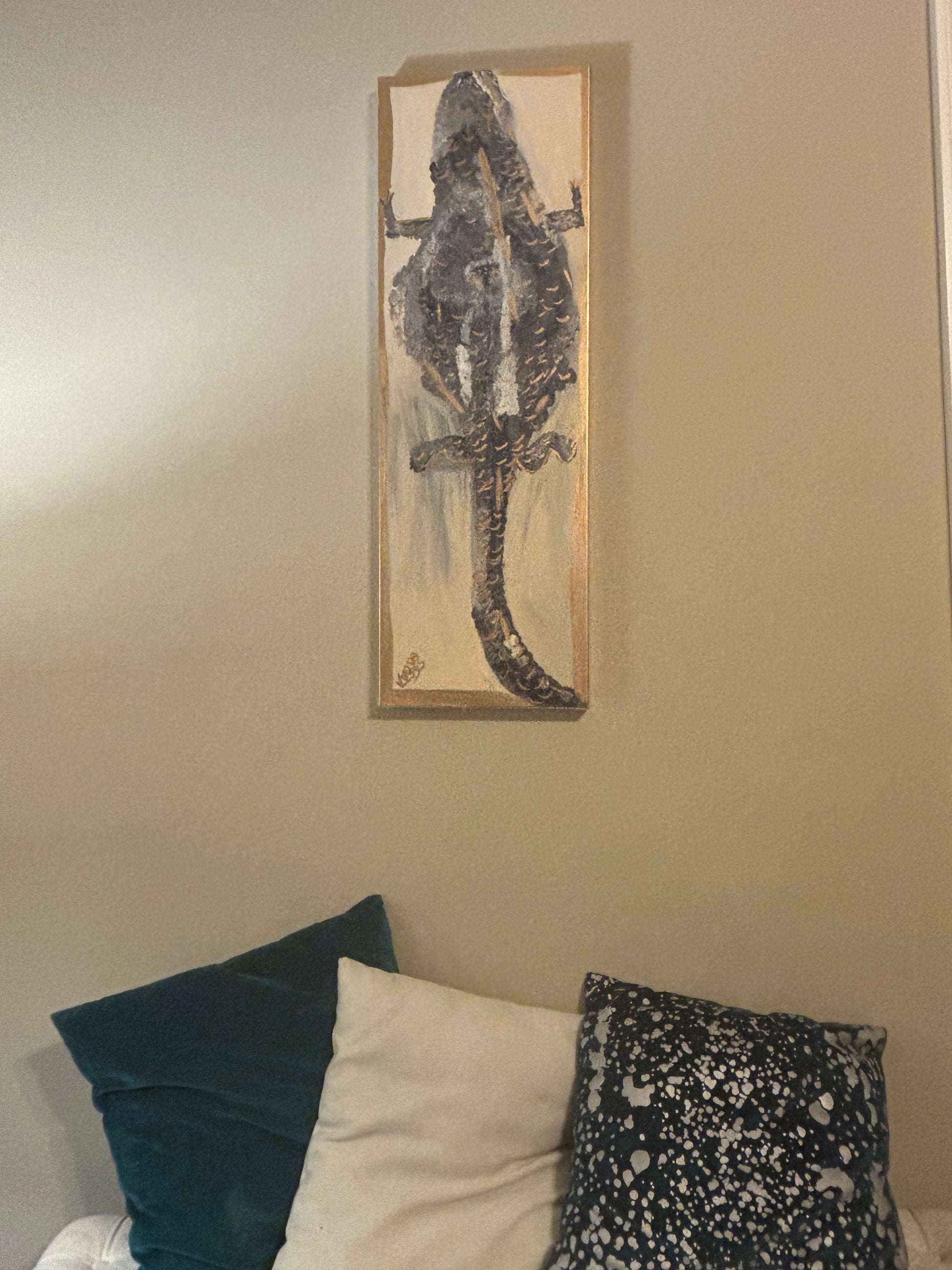 Deep shades of blues, gold and cream accent this unique Gator 🐊 design on this 12x36 canvas. One of a kind and this is an original design. Sealed and signed by artist. Grab this piece today for a little extra flair for your space!