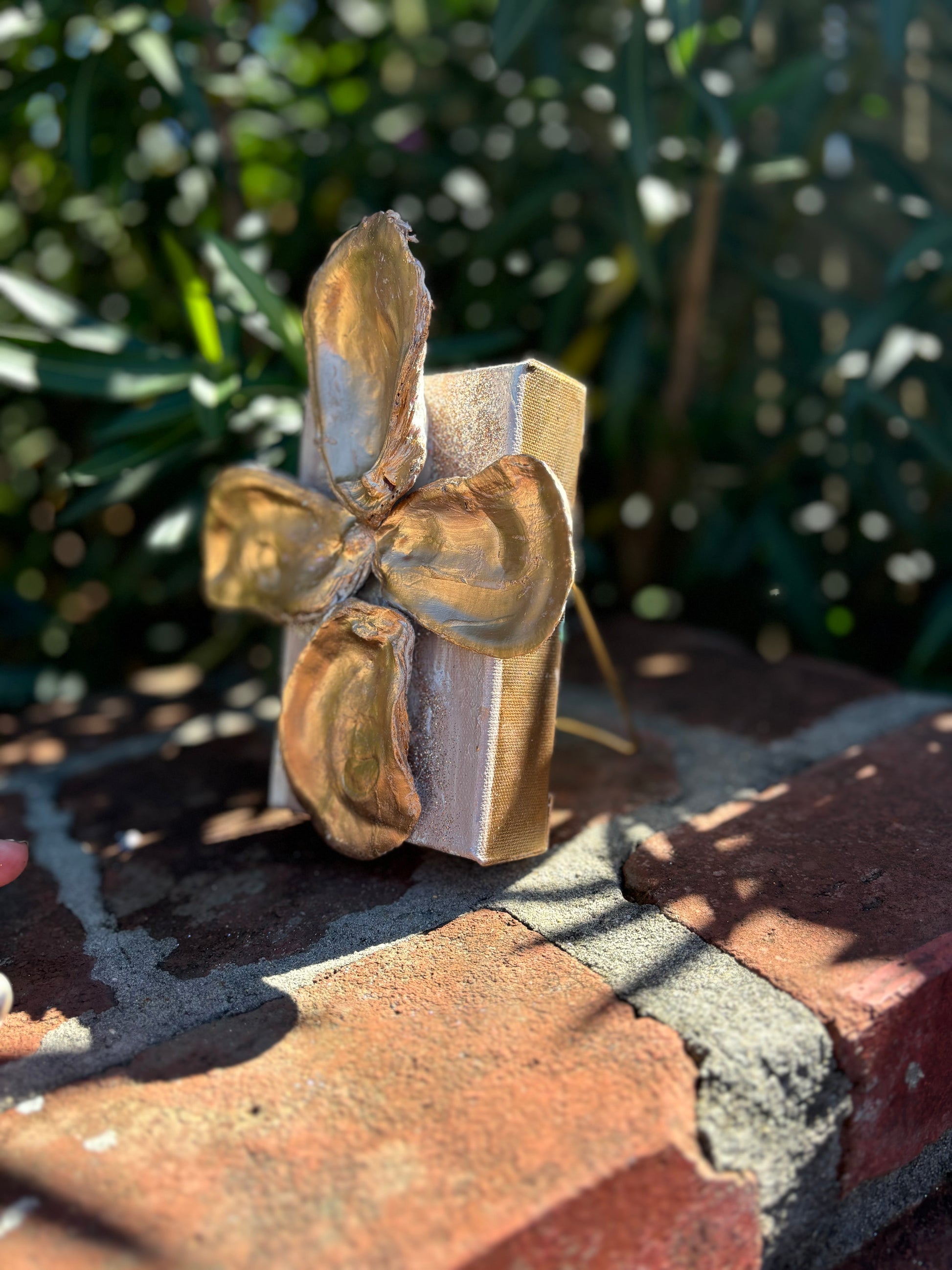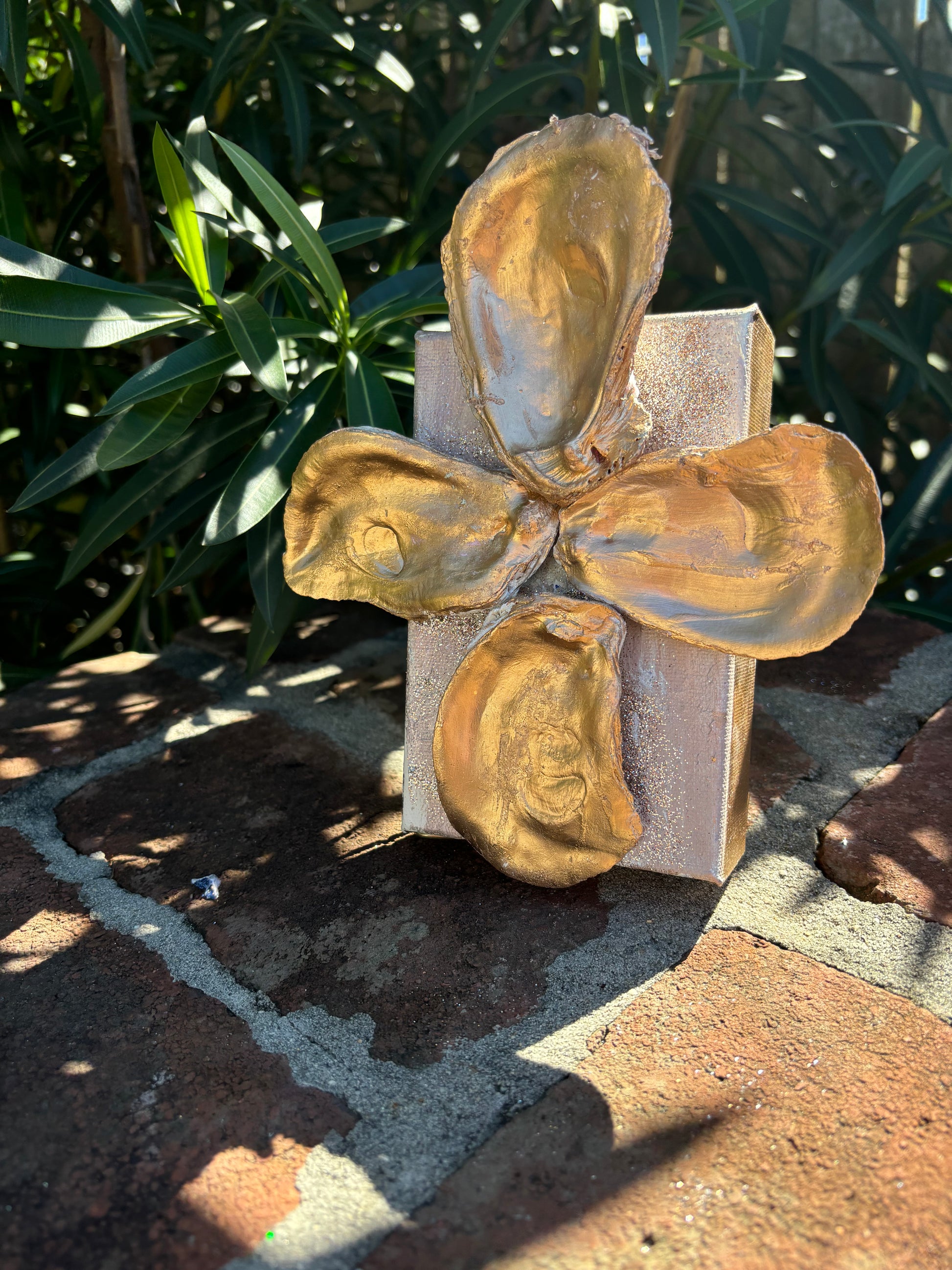 Beautiful painted oysters in liquid gold accent this block canvas. An elegant piece for a small space. These come with an acrylic or gold easel to use for display.Â