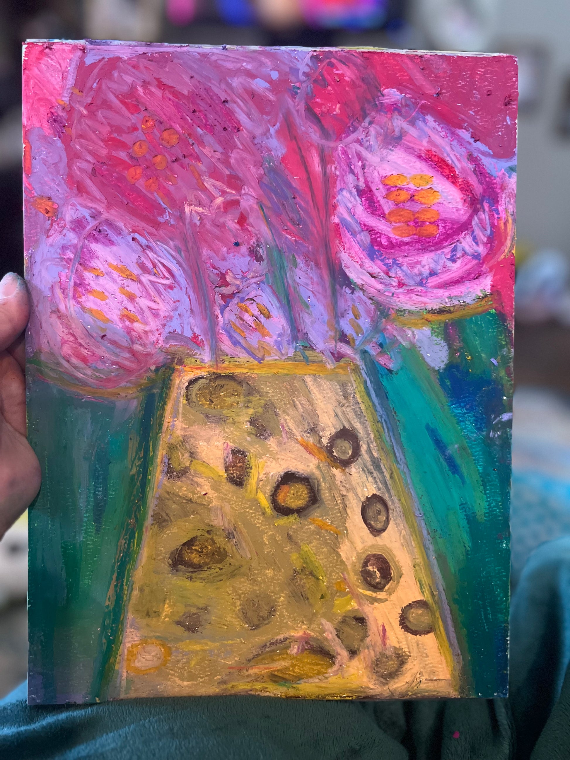 This fun, whimsical oil pastel drawing of roses in a leopard vase is such a fun idea! Beautiful shades of pink, green and gold make for a fun statement piece! This one comes framed in a gold frame!ย
