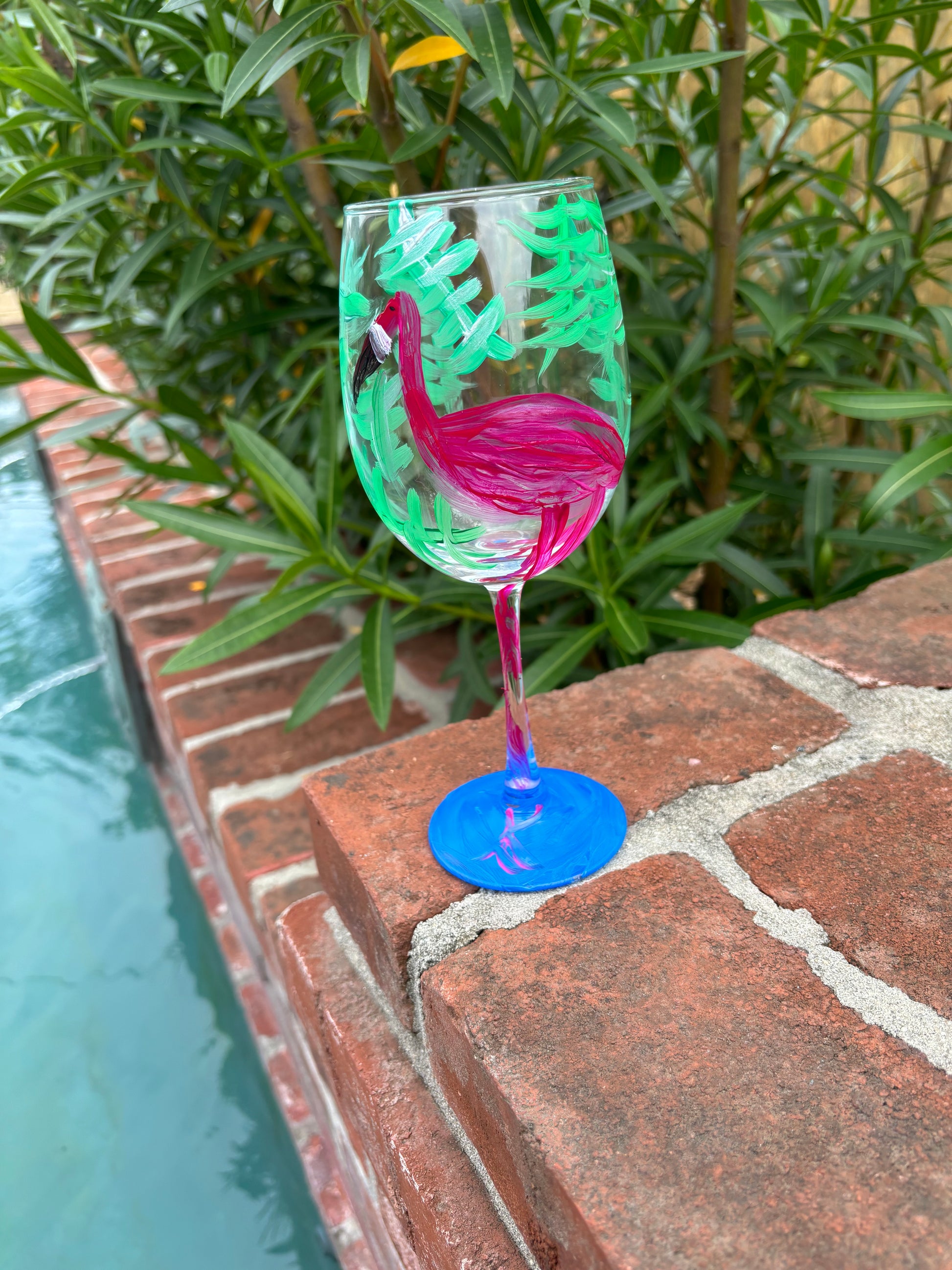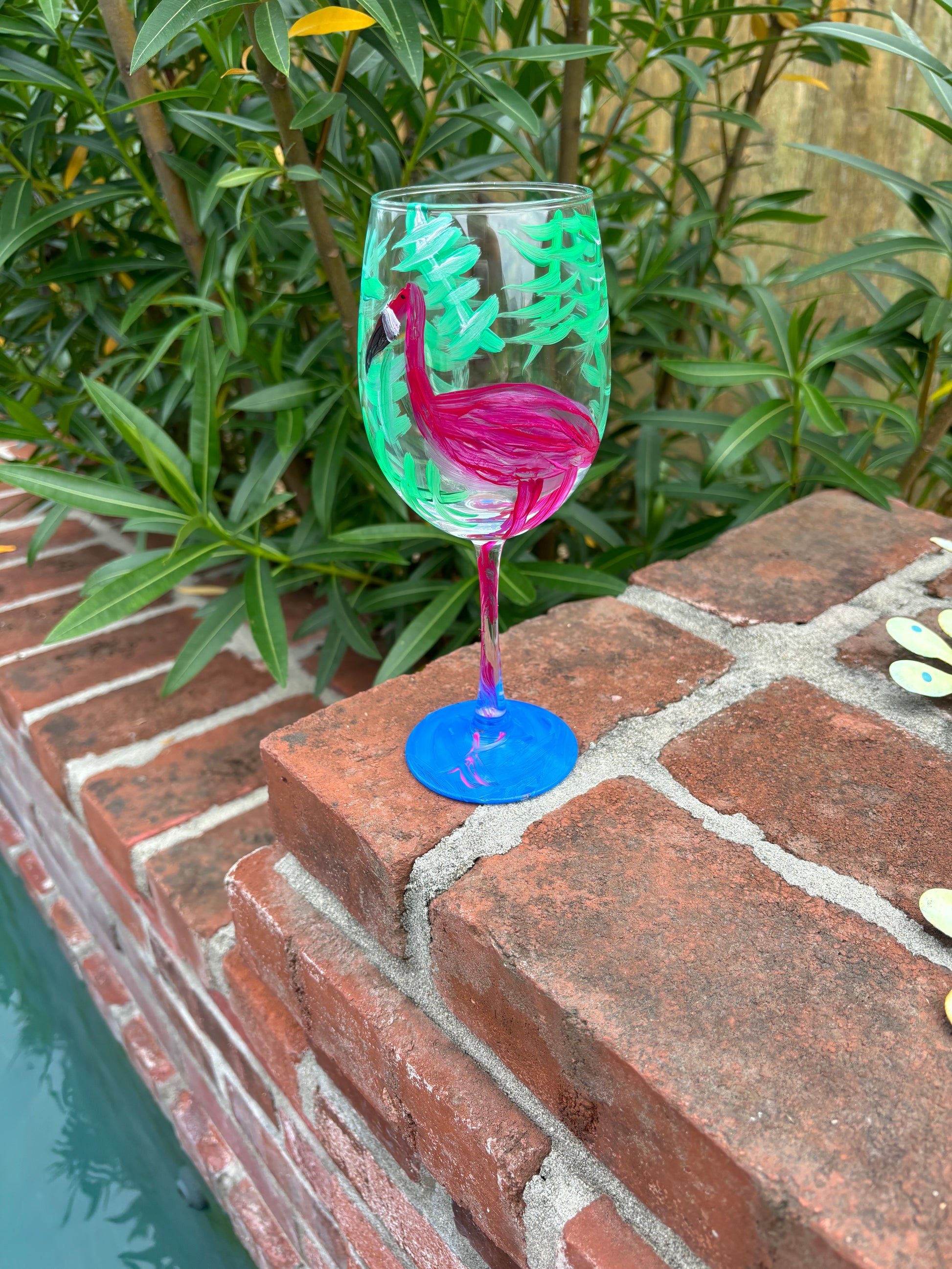 Enjoy your wine this summer in this fabulous “ Fiona the flamingo 🦩 “ wine glass! Hand- painted by me and hand wash only! Only one like it!!
